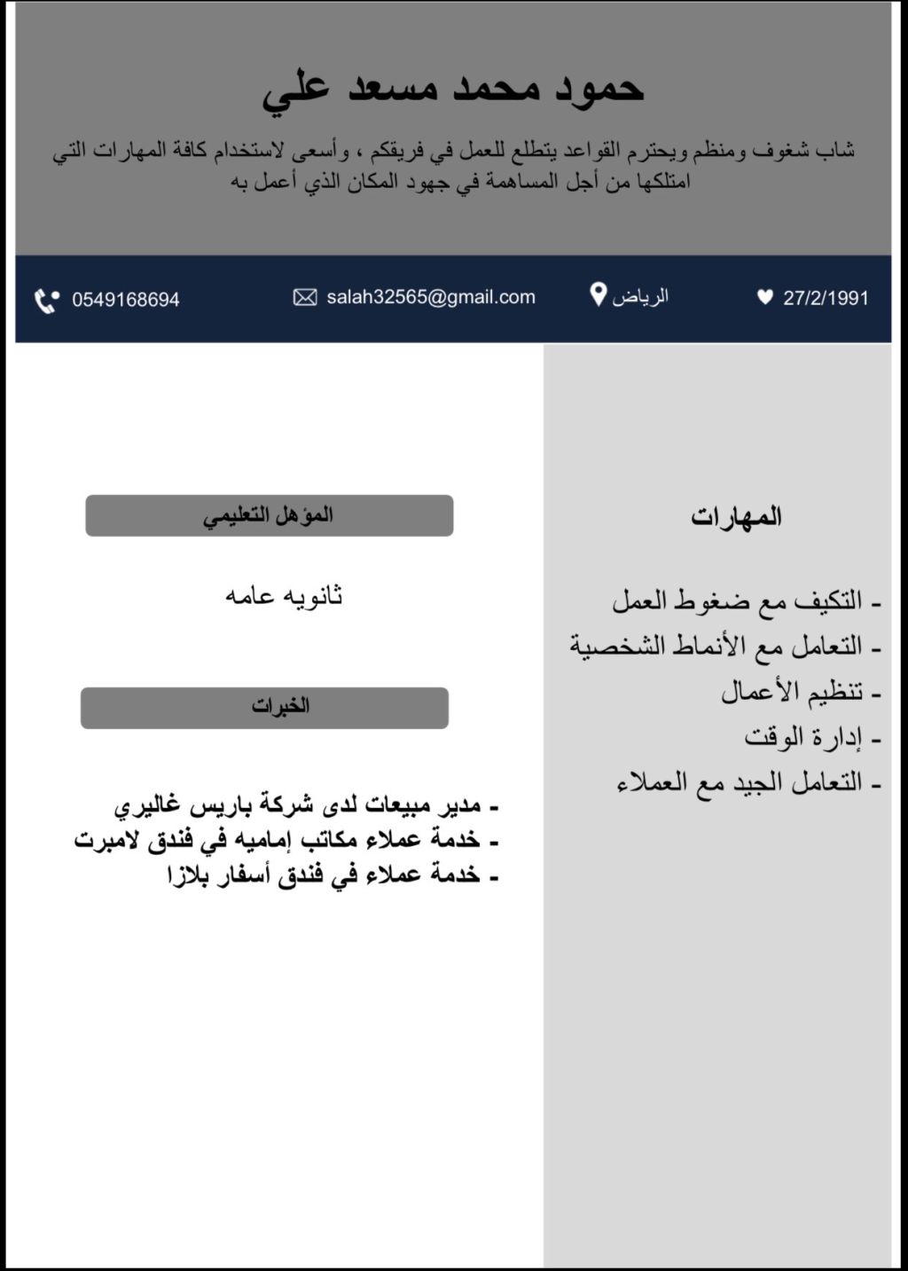 أنا اعمل موظف استقبال لمدة 7 سنوات ومشرف شفت وعملت بائع عطور لدي شركة باريس غاليري لمدة 3 سنوت