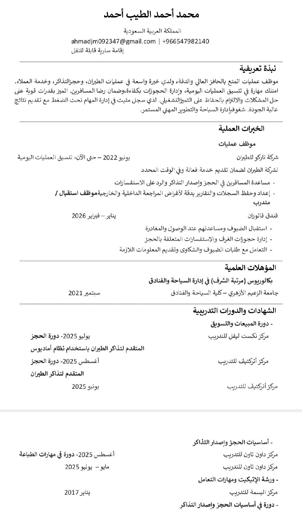أنا محمد أحمد الطيب سوداني الجنسية مقيم بالمملكة لدي بكالوريوس مرتبة الشرف في السياحة والفنادق ولدي العديد من شهادات الخبرة كما هي مرفقه في أل CV ولدي دراية جيده بنظام نزيل وبوكينج للحجز الفندقي مجتهد وراغب بالعمل