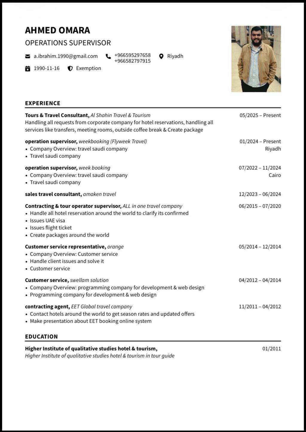 ابحث عن فرصة عمل في مجال شركات السياحة يوحد لديه خبرة أكثر من 13 سنة في نفس المجال اصدار التذاكر وحجوزات الفنادق والبرامج السياحة