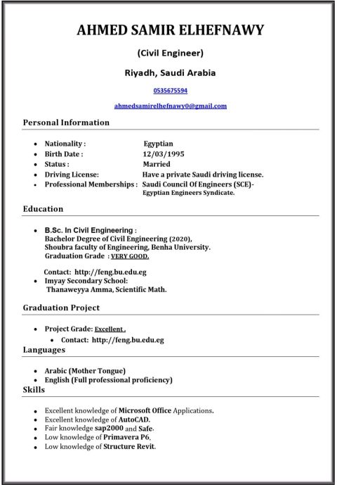 Civil engineer with + 5 years of experience, including 3 years in KSA (concrete works, finishing, and engineering offices supervising construction) registered with the Saudi Council of Engineers, holding a valid Saudi driver's license and a valid, transferable Iqama, Currently residing in Riyadh and willing to work anywhere in KSA in a suitable work environment