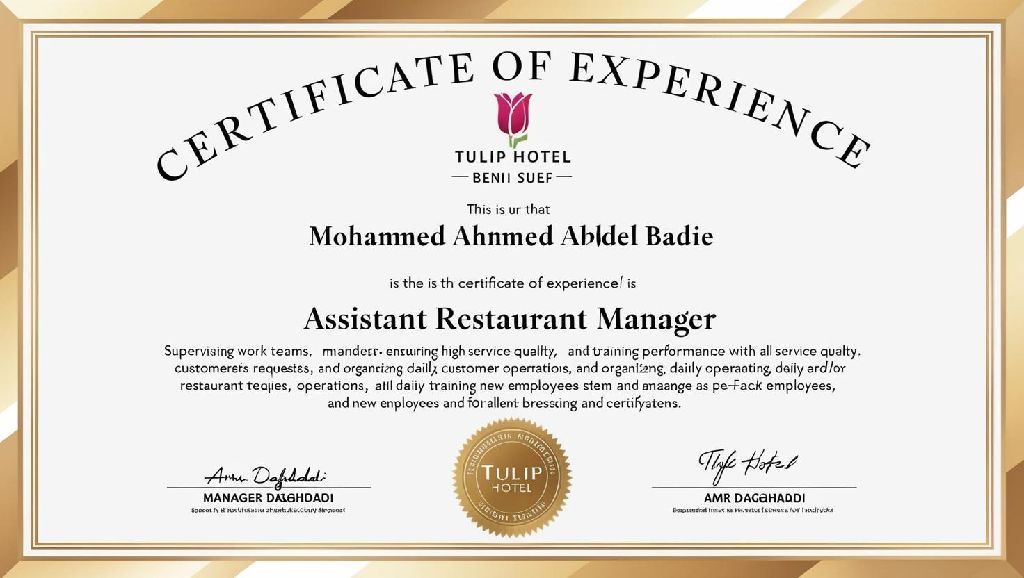 أنا حاصل على بكالوريوس السياحة والفنادق ولدي خبرة تزيد عن 10 سنوات في مجال الضيافة وإدارة المطاعم، حيث شغلت عدة مناصب كانت تتطلب مهارات القيادة والاشراف على العمليات اليومية، بالاضافة الى التعامل مع العملاء وحل مشكلاتهم بشكل فعال. أستطيع أن أقدم لمؤسستكم قدرة على تنظيم وتوجيه فرق العمل بكفاءة. مهارات في تحسين تجربة العملاء وضمان تقديم خدمات عالية الجودة. خبرة في إدارة المخزون