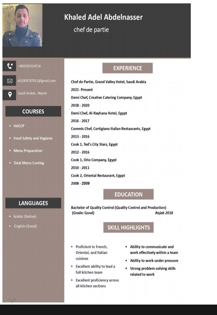 شيف ديبارتي سخن مصري شغل فنادق ومطاعم إقامة سارية