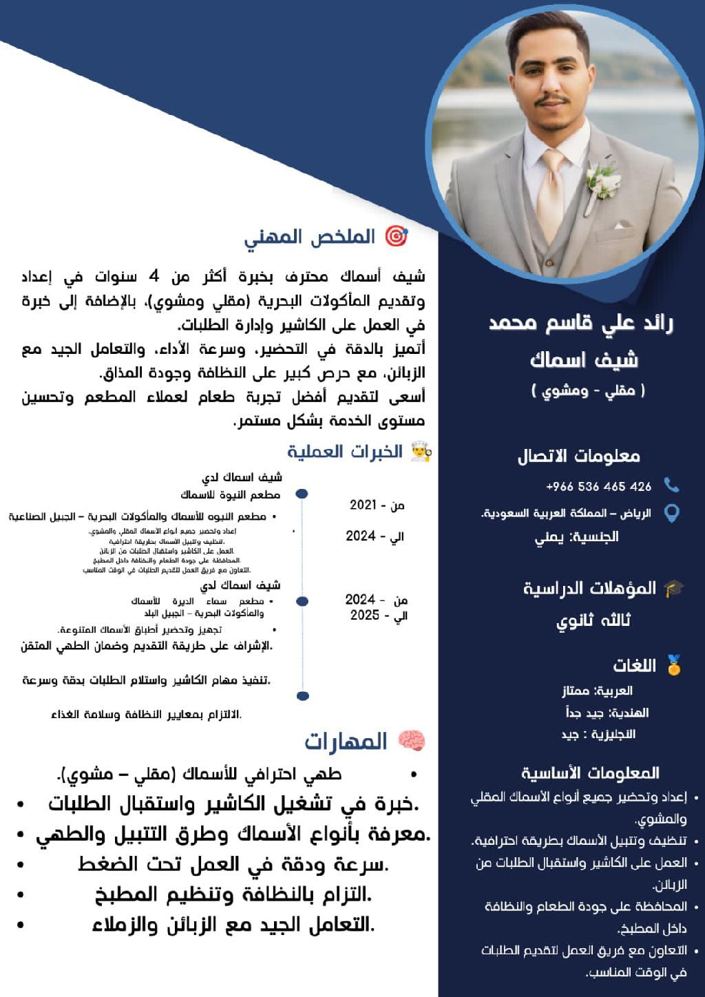 شيف أسماك محترف رائد علي قاسم محمد بخبرة تزيد عن 4 سنوات في اعداد المأكولات البحرية (مقلي ومشوي) وأجيد العمل على الكاشير واستقبال الطلبات بسرعة ودقة عملت في مطعم النيوه للأسماك والمأكولات البحرية في الجبيل الصناعية، ثم في مطعم سماء الديرة للأسماك والمأكولات البحرية في الجبيل البلد ابحث الآن عن فرصة عمل في الرياض داخل مطعم يهتم بالجودة والطعم المميز أتميز بالنظافة
