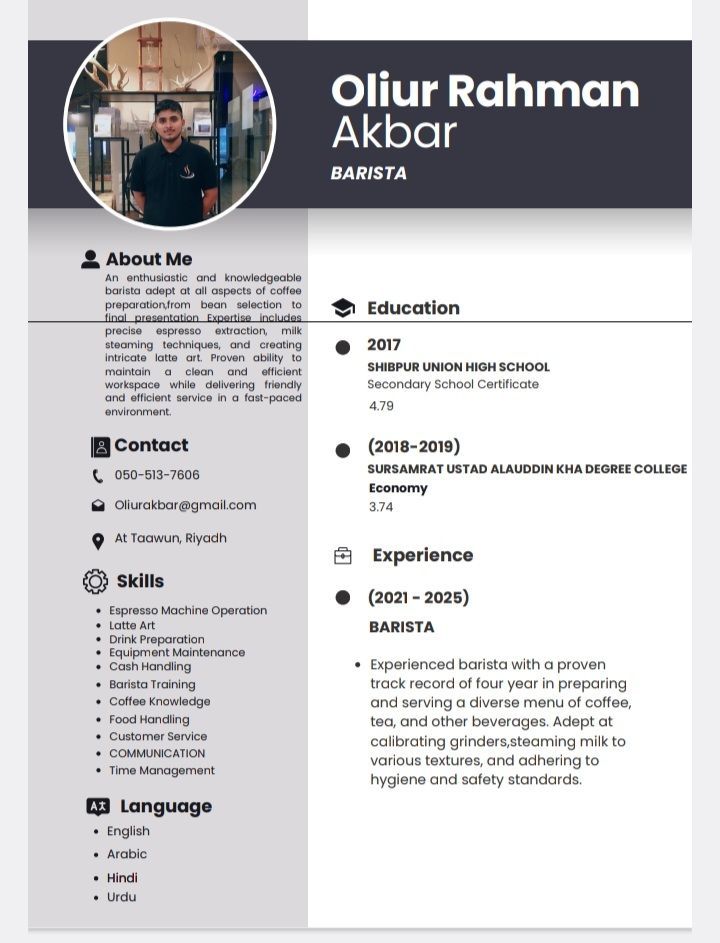 أنا باريستا أحتاج الى وظيفة باريستا لدي خبرة في القهوة منذ 4 سنوات و7 أشهر أعرف القهوة الساخنة والقهوة الخاصة والقهوة الباردة والموهيتو والعصير وأعرف الفطائر والكريب والوافل