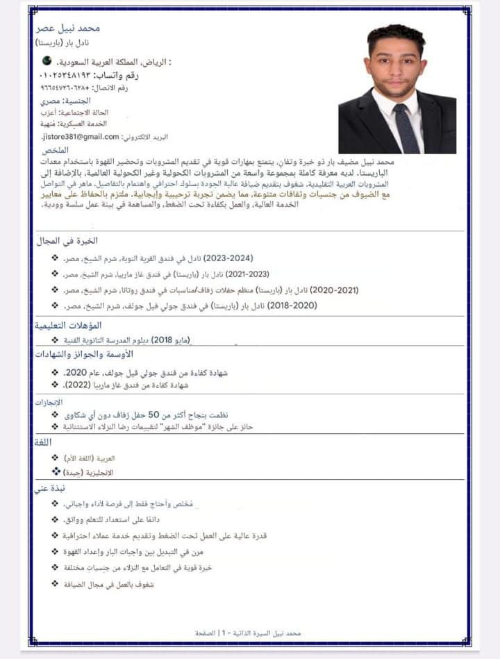 ابحث عن وظيفة وايتر أو بار مان عملت في عدة أماكن في شرم الشيخ في مصر فنادق 5 نجوم عندي خبرة أكثر من 3 سنين في الضيافة والتعامل مع ثقافات مختلفة شغوف بالعمل اعمل تحت ضغط معيا إقامة مهنية سارية موجود في الرياض أعرف أكتب وأتكلم انجليزي بنسبة 60% وأعرف أتعامل مع معظم الجنسيات المختلفه الأوروبية أو العربية المختلفه أو الروسية