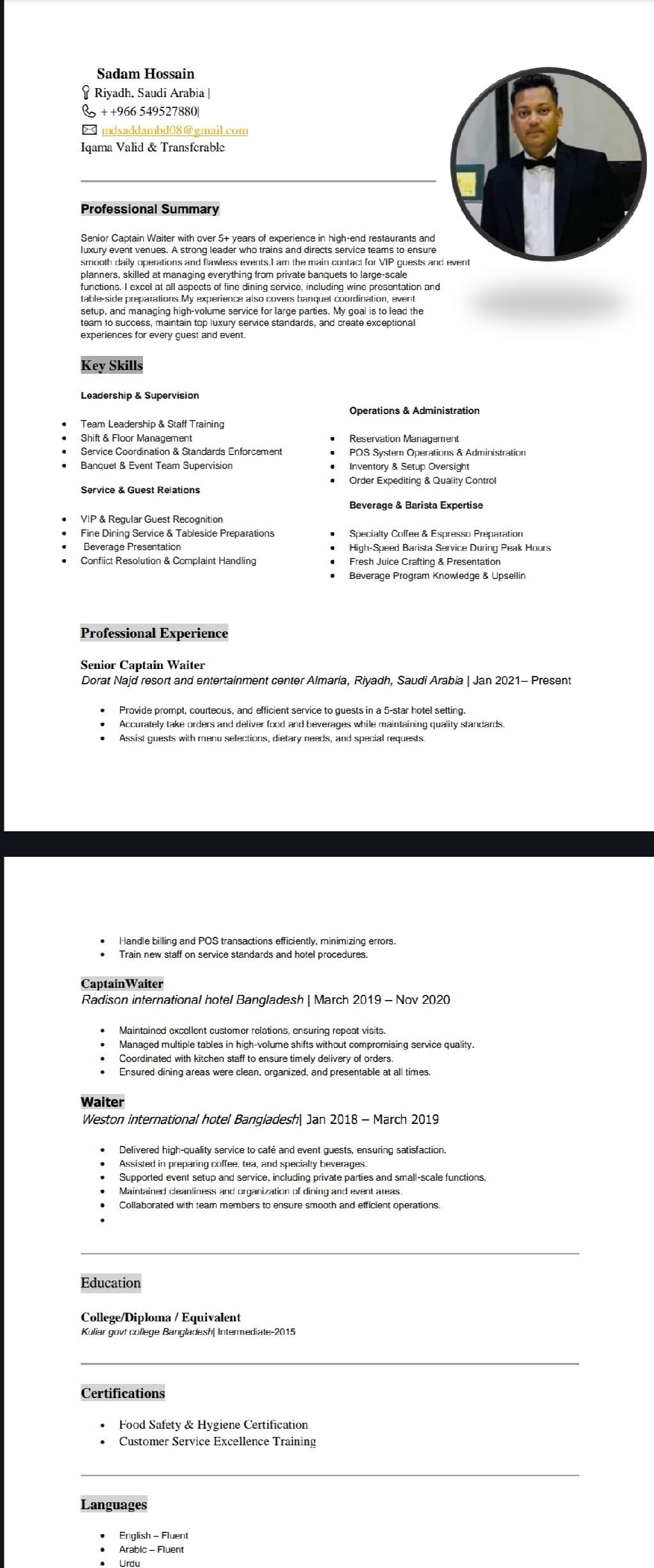 I am Saddam Hossain. I am Waiter, Captain, also Barista. I have a Experience this job