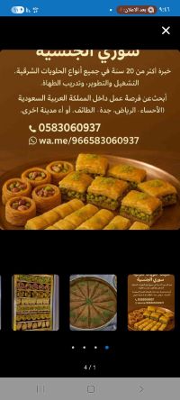 شيف حلويات شرقية سوري الجنسية خبرة في جميع أنواع الحلويات شرقية وتشغيل وتطوير وتدريب يبحث عن عمل داخل السعودية الاحساء الرياض جدة طائف أو أي مكان آخر للتواصل