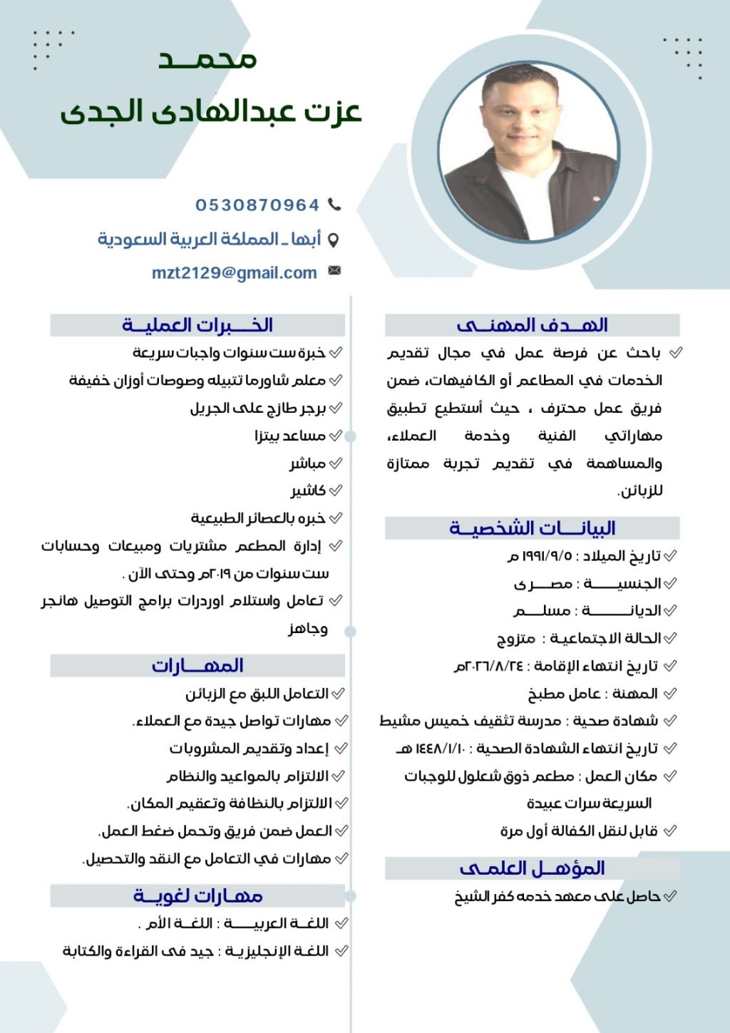 مصري يبحث عن عمل 6 سنوات خبرة وجبات سريعه موجود إقامة وشهادة صحيه نظامي مدرسة