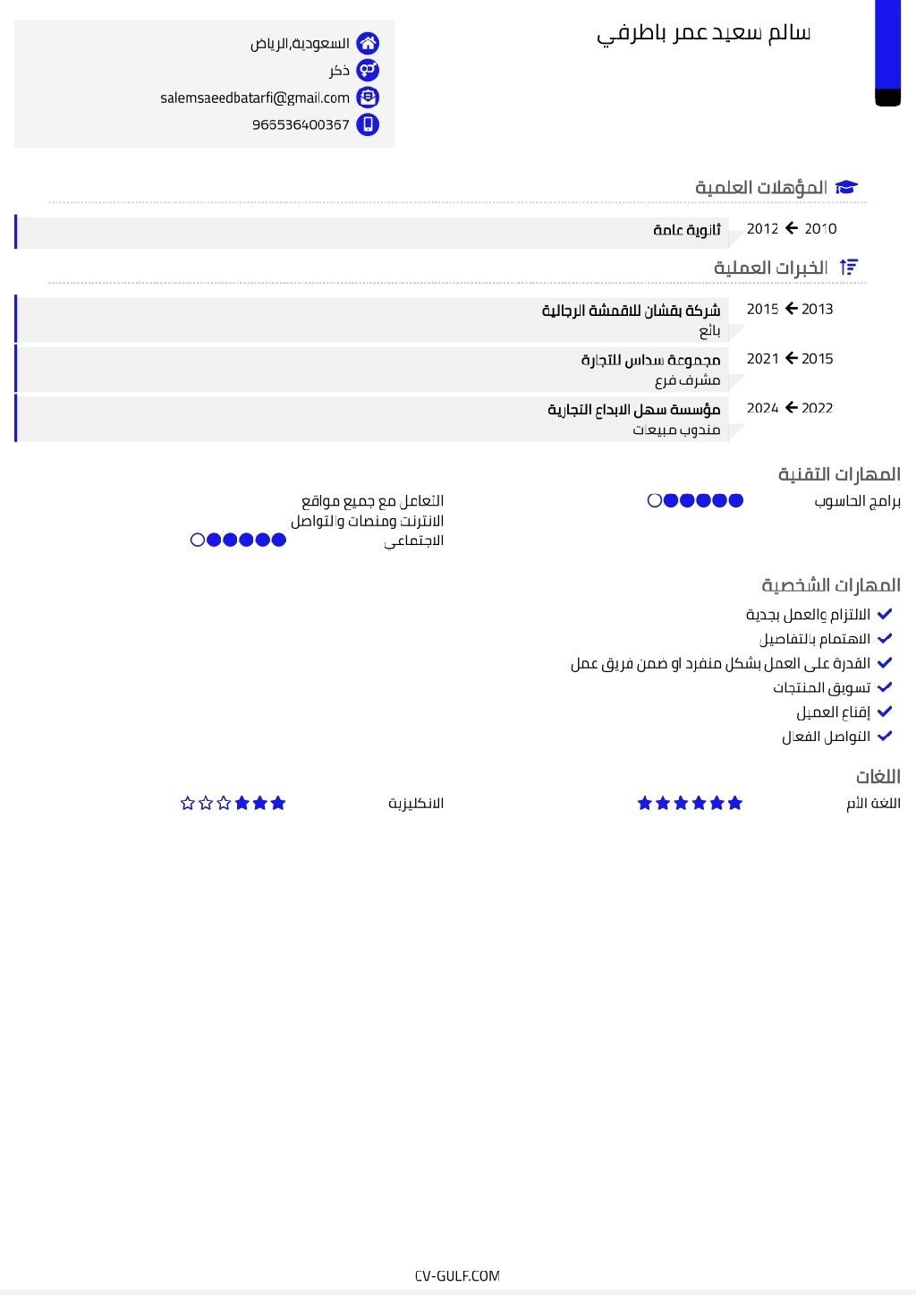 شاب يمني حضرمي يبلغ من العمر 26 يبحث عن عمل في مجال المبيعات أو السواقة أتعامل بالأسلوب الراقي ورضا الزبون ولاهتمام بالمظهر واحترام أوقات العمل للقدرة على تحمل ضغط العمل وأحب العمل بروح الفريق الواحد واتمنى المصداقية