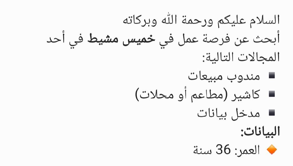 ابحث عن فرصة عمل في خميس مشيط في أحد المجالات التالية مندوب مبيعات كاشير (مطاعم أو محلات) مدخل بيانات البيانات العمر 36 سنة رخصة قيادة متوفرة إقامة سارية المفعول الجدية والالتزام في العمل متوفرة بإذن ومن لديه فرصة مناسبة أو يستطيع المساعدة فيلا جزيل الشكر والتقدير وجزاكم الله خير الجزاء