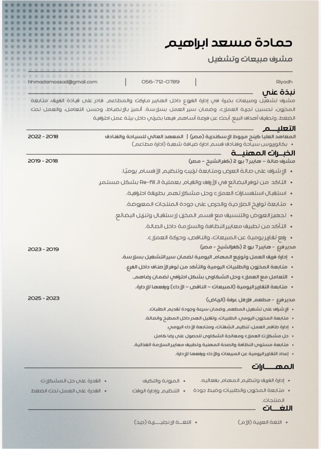 باحث عن عمل مصري 26 سنة بكالوريوس سياحة وفنادق خبرة تزيد عن سنتين بالمملكة في مجالات التشغيل والمبيعات إقامة سارية رخصة قيادة سارية