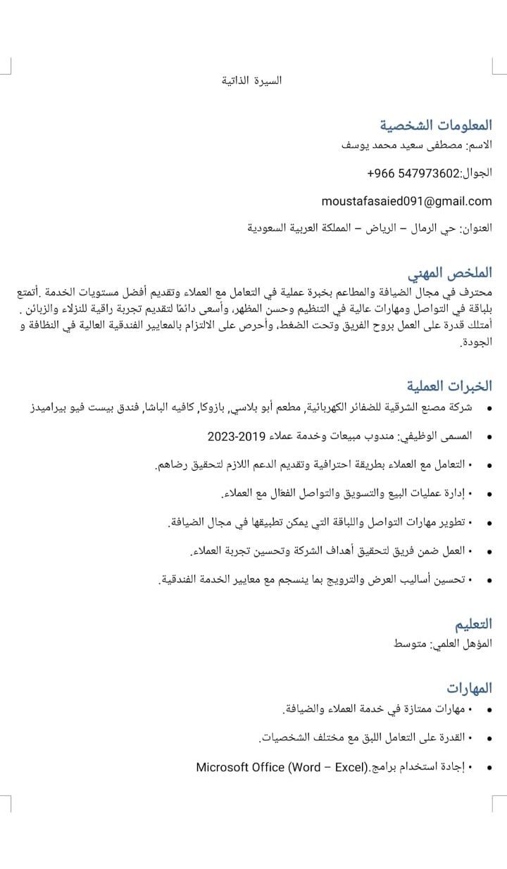 أنا مقيم في السعودية ابحث عن عمل كابتن صالة - وايتر - روم سرفيس - مدير صالة - بيكب - مساعد أي عمل يتعلق بالمطاعم والكافيهات والضيافة خبرة 7 سنين داخل وخارج السعودية لدي عمل بروح الفريق والتعاون وحفظ النظافة والسلامة والعمل تحت ضغط + حسن المظهر جدا متواجد في حفر الباطن ويمكن التنقل الى أي مكان داخل السعودية التواصل واتساب أو الاتصال
