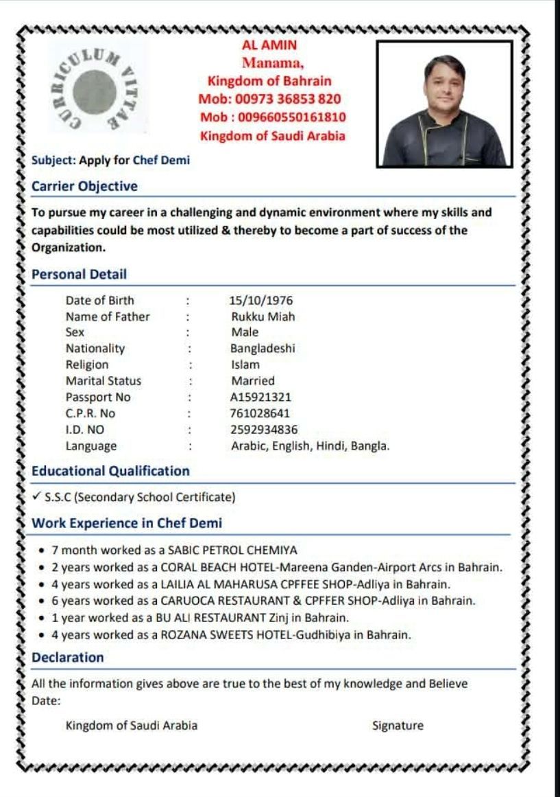 بنغالي خبرة عشر سنوات في المطاعم البحرين والسعودية للتواصل معي السي في موجود