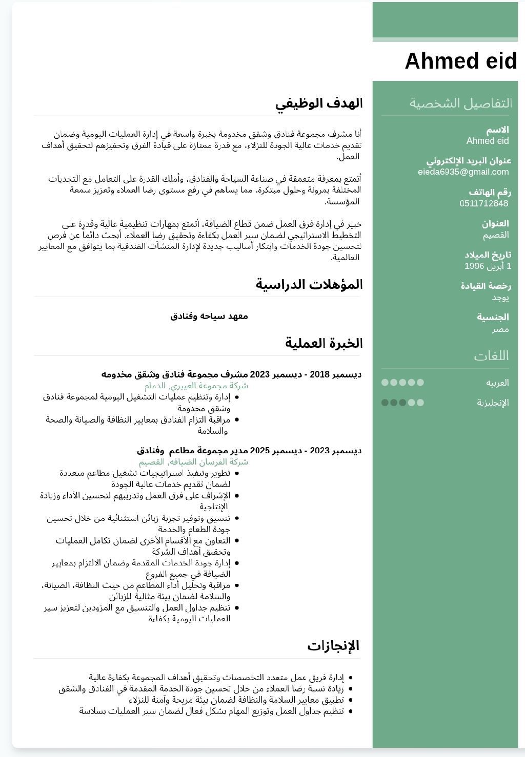 متخصص في مجال الفنادق والمطاعم والشقق المخدومة
