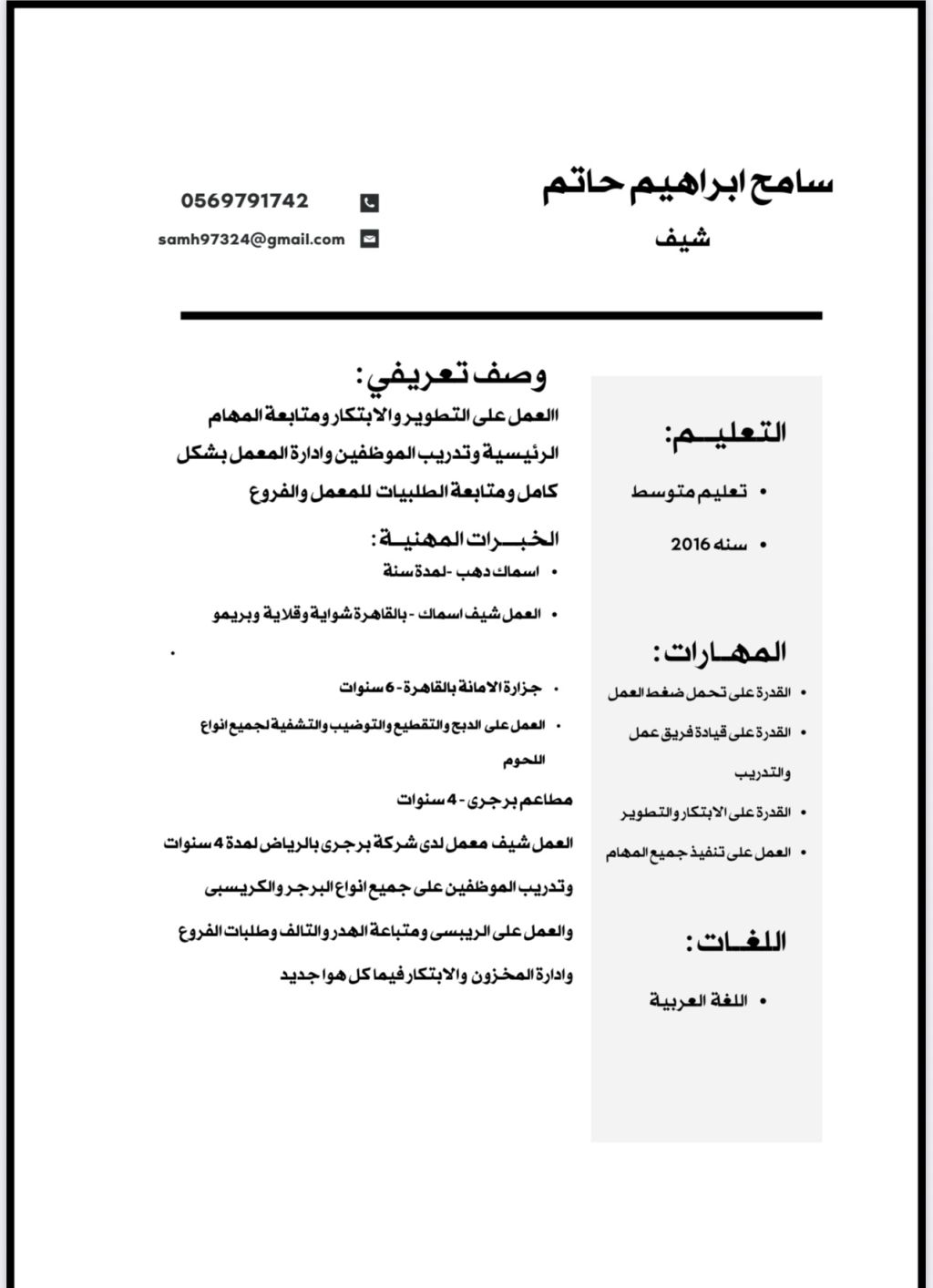 شاب مصري يبحث عن عمل - خبرة بالفاست فود برجر وسماش والكريسبي - خبرة بالأسماك والمقلي والبريمو والفرن - خبرة بالجزارة والتقيطع وألتشفيه والفرم - إقامة سارية وامكانية نقل الكفالة والانتقال الى أي مكان في المملكة