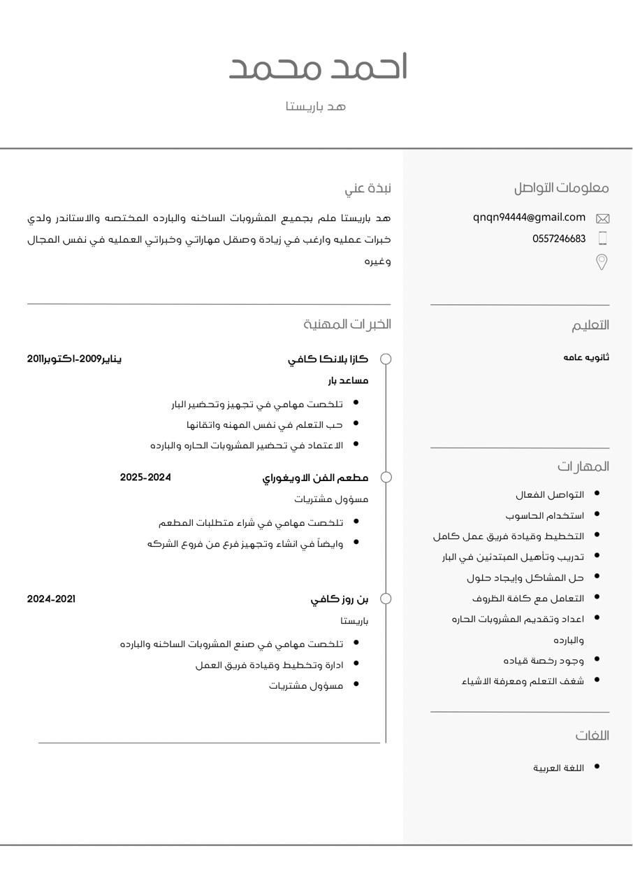 هد باريستا جميع المشروبات الحارة والباردة بجودة عالية وتكاليف مخفضه شخصيه قيادية (سوبر فايزر) باقي التفاصيل CV إقامة سارية رخصة قيادة متوفره