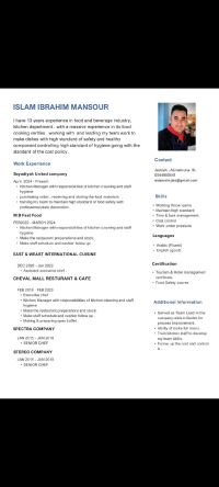 شيف اسلام مصري الجنسية خريج سياحة وفنادق قسم مطبخ واشتغلت إيطالي وشرقي وفاست فود في برندات شهيرة موجود في السعودية من 2016 أجيد تدريب الموظفين وتعليمهم وعمل منيو بالريسبي وأشرف على تشغيلة ومتابعه حركة الدوام وتسجيل الفواتير والهالك والتحويلات علي فوديكس مأكولات بحرية وإيطالي وفاست فود جيد جدا. موجود في جدة الإقامة منتهية من شهرين آخر مسمي وظيفي مدير مطبخ الفرع الرئيسي ونائب مدير الفرع شركة الصيادية