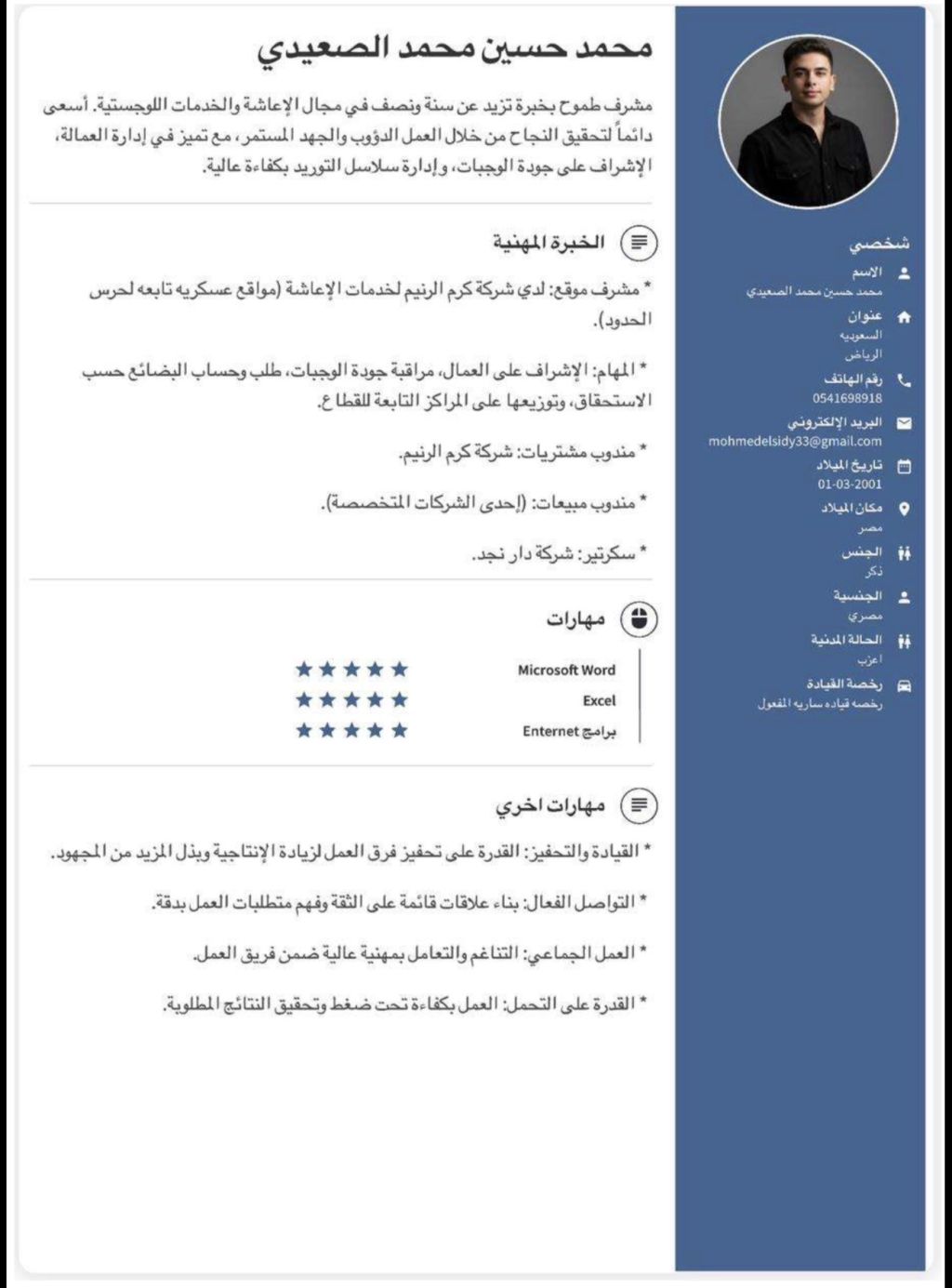 مشرف اعاشة (مصري الجنسية) متاح للعمل فورا. خبرة أكثر من عام ونصف في مجال الاعاشة، متميز في الاشراف على الوجبات، جودة الغذاء، وإدارة طاقم العمل لضمان أعلى مستويات الخدمة. الخبرة 1.5 سنة