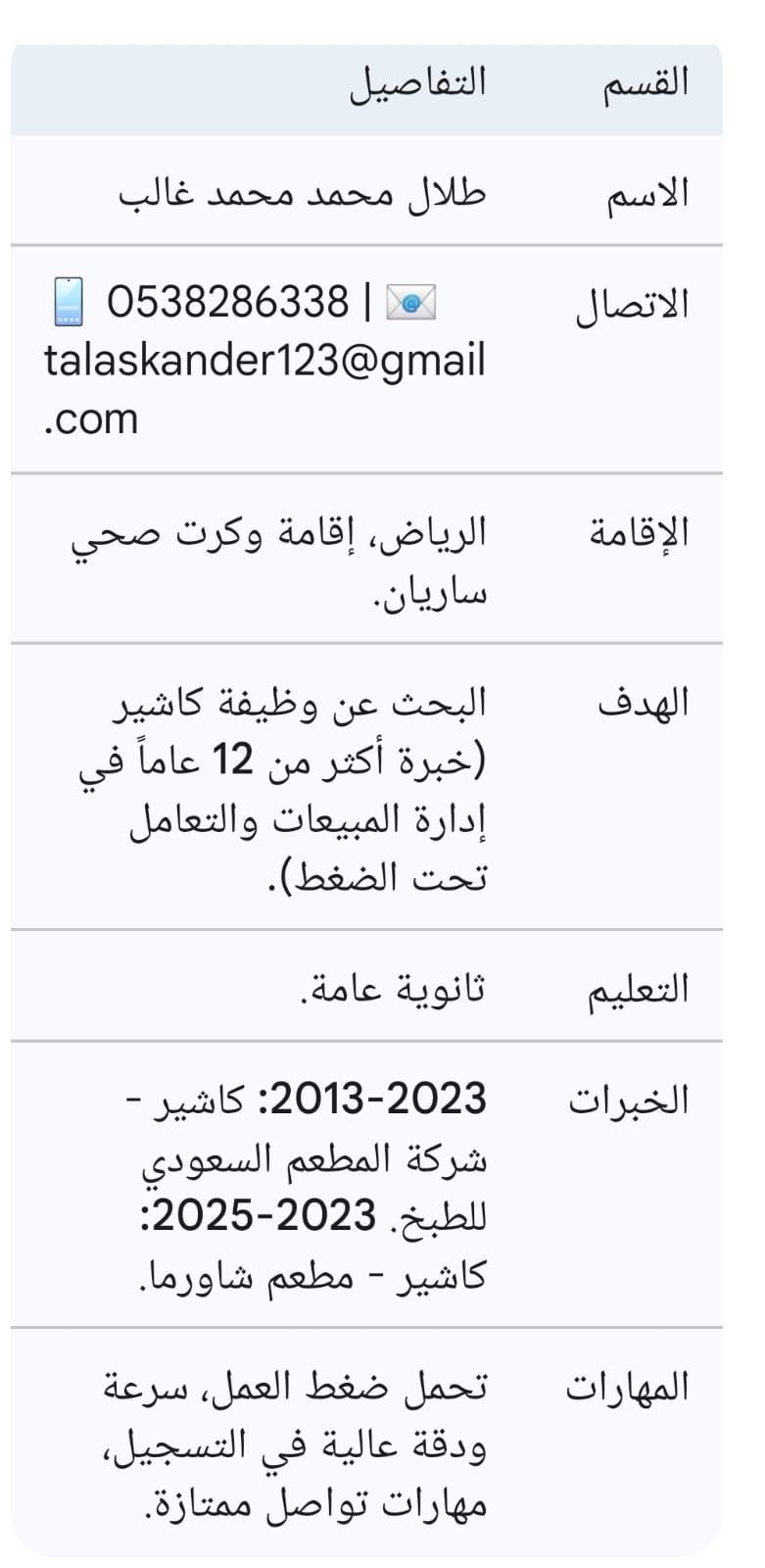 كاشير يمني خبرة 13 سنة في مجال مطاعم الكبسه ومطاعم الشاورما إقامة سارية وكرت صحي ساري من الرياض مستعد للعمل في أي مدينة