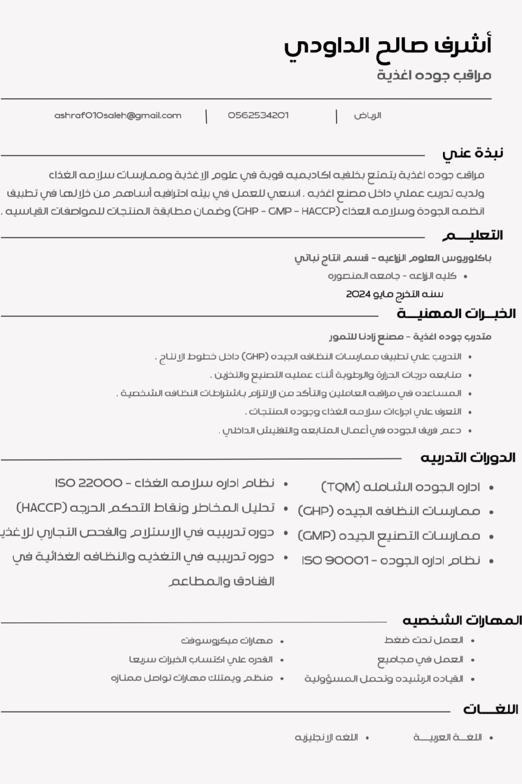 مراقب جودة اغذيه حاصل علي عديد من الدورات التدريبية وأتمتع بخلفيه أكاديمية عالية وعملت داخل مصنع تمور ومعمول وأجيد تطبيق كل من (HACCP - GMP - GHP)