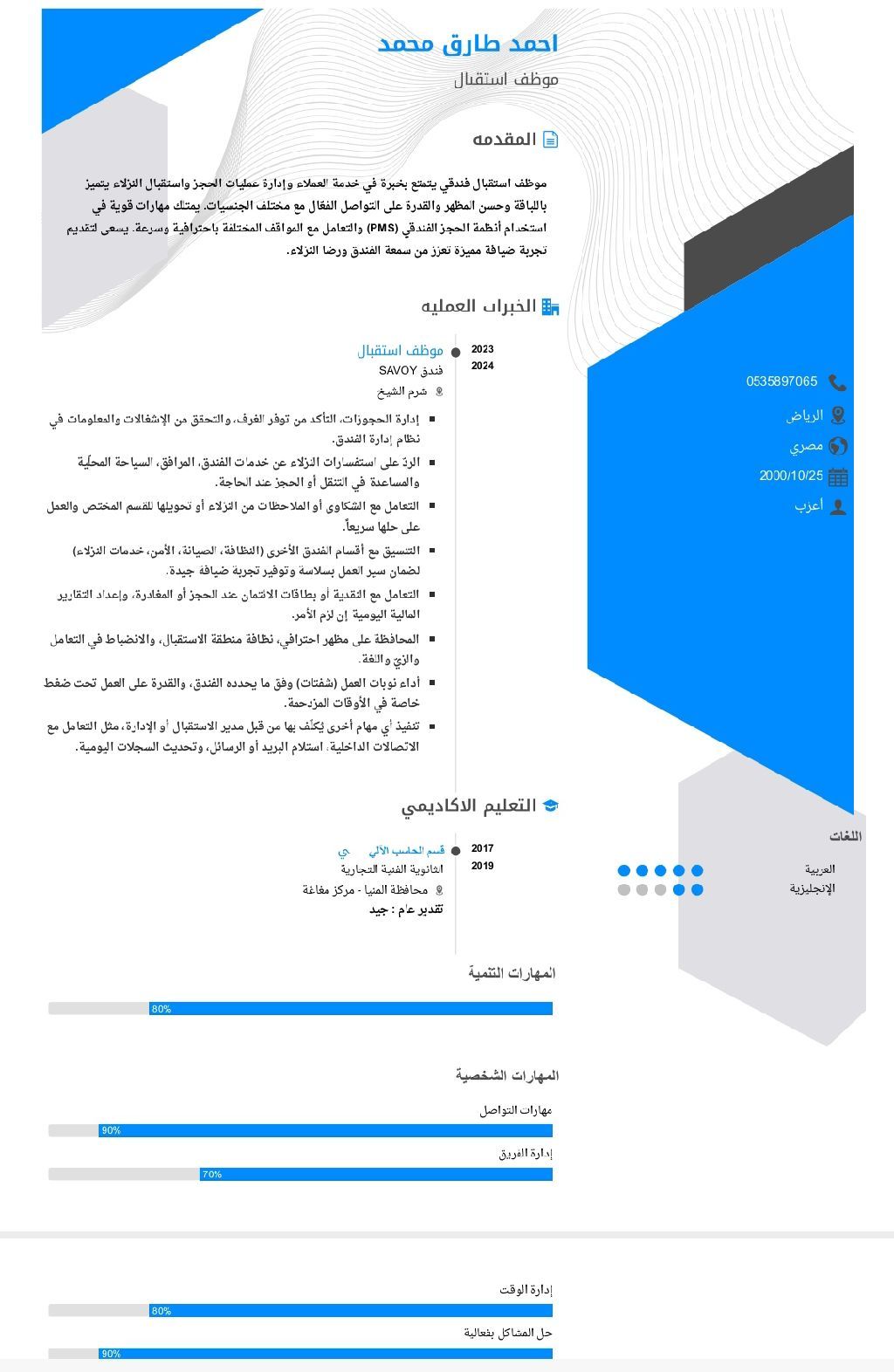 ابحث عن فرصة عمل في مجال الاستقبال. موجود في السعودية إقامة سارية وقابلة للنقل أتمتع بمهارات تواصل ممتازة، وقدرة على التنظيم وإدارة الوقت بكفاءة. لدي خبرة سابقة في التعامل مع العملاء وتقديم الدعم اللوجستي، وابحث عن بيئة عمل تتيح لي التطور والمساهمة بفعالية