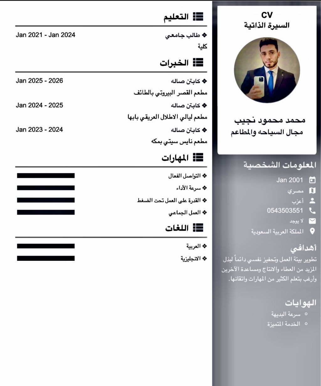 كابتن صالة مصري الجنسية 25 عام تم العمل بأكثر من مكان بالمملكة وعلي داريه كاملة بالمطاعم الشامية واللبنانيه والمطاعم الانترناشونال
