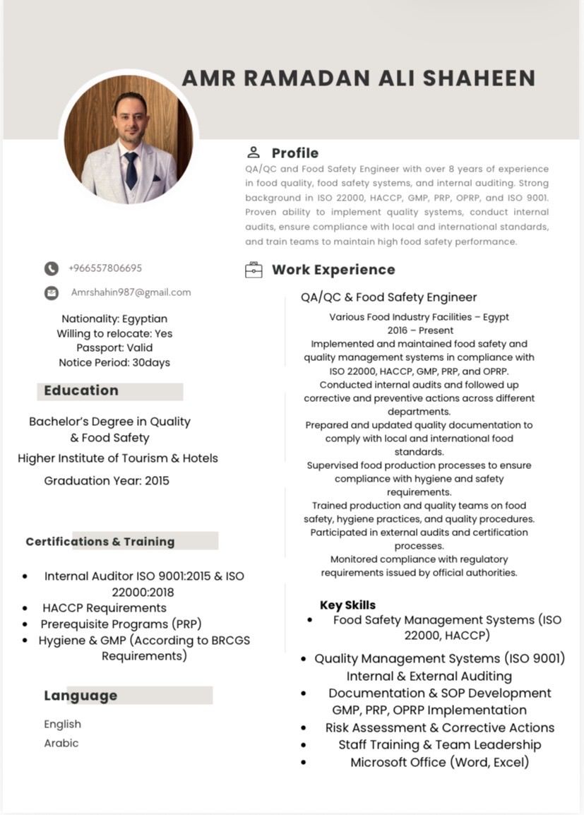 ابحث عن عمل مراقب جودة وسلامه غذاء موجود في الدمام