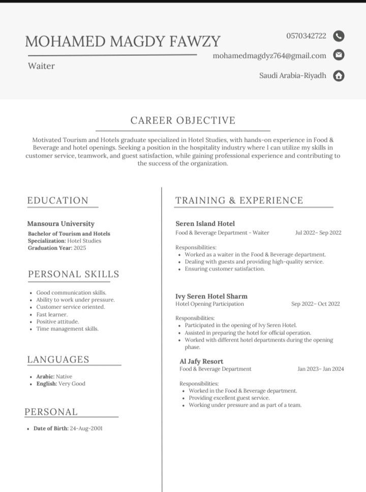 أنا محمد ابحث عن عمل في فنادق ومطاعم خريج كلية سياحة وفنادق واشتغلت 3 سنين في شرم الشيخ وايتر