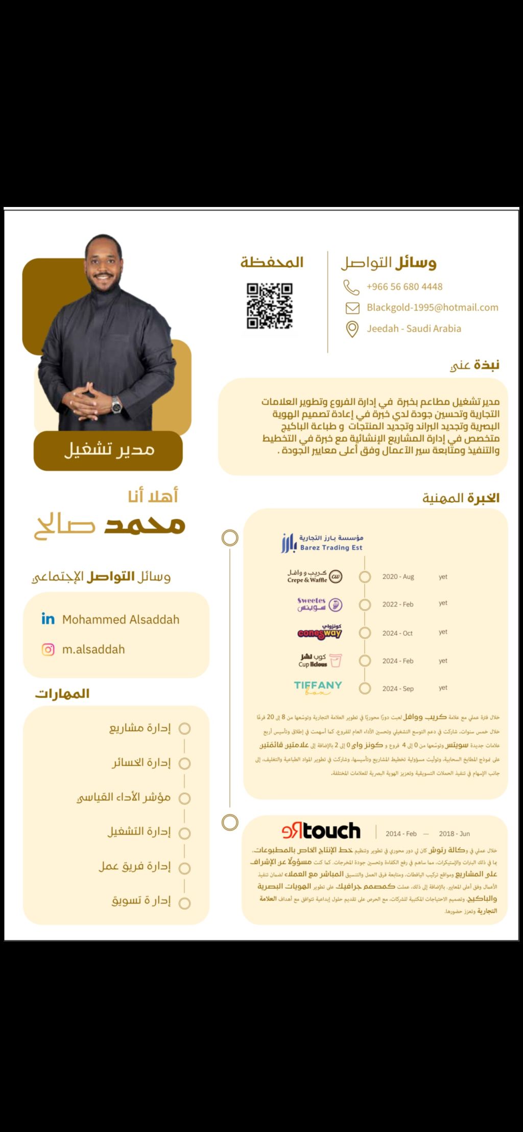مدير تشغيل بخبرة تزيد عن 5 سنوات ونصف في إدارة وتشغيل أنظمة المطاعم، والاشراف على سير العمل اليومي