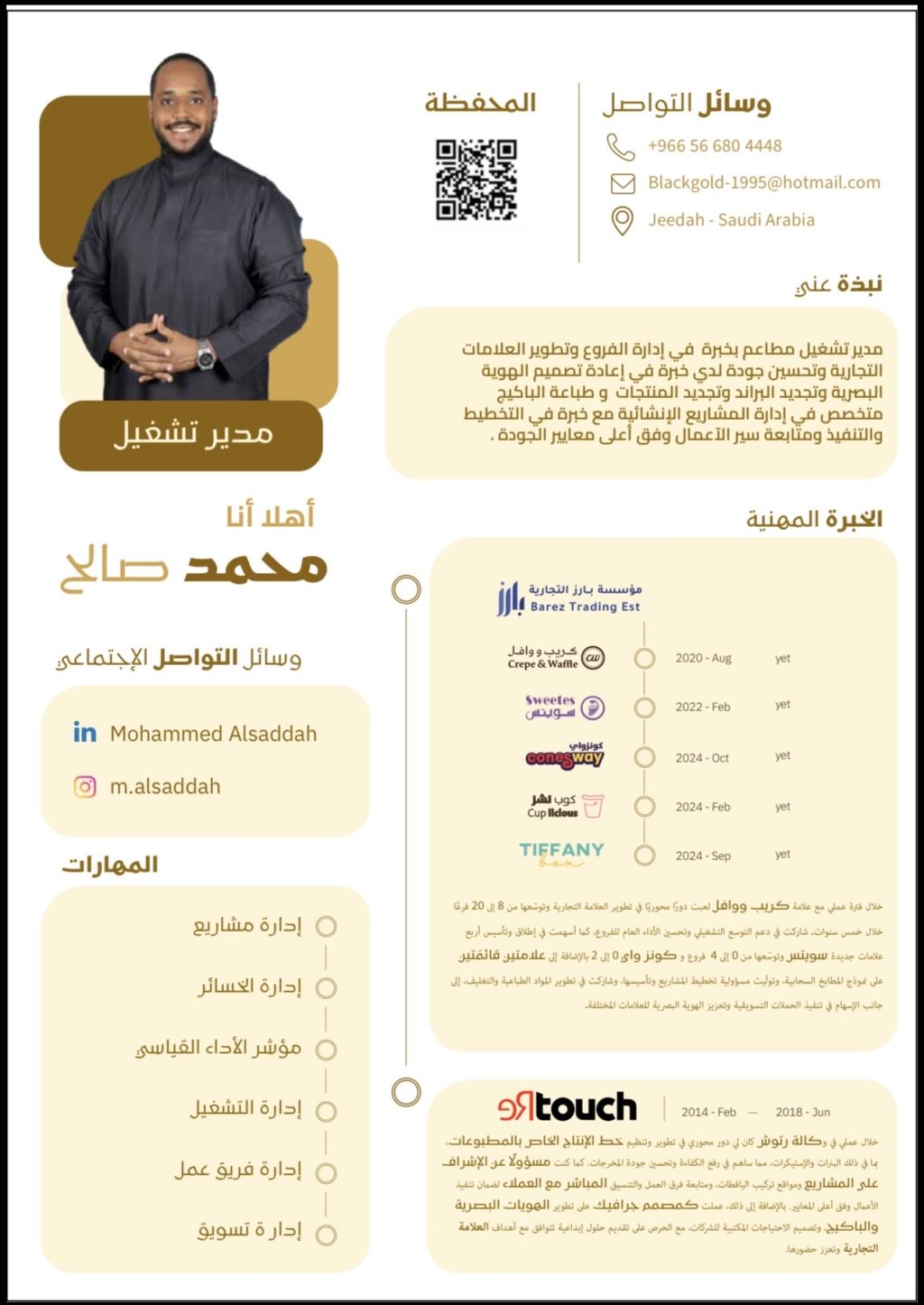 مدير تشغيل في عملي كمدير عمليات لدى Barez EST لأكثر من خمس سنوات، ركزت جهودي على تطوير العلامات التجارية وتحقيق التوسع المستدام. ساهمت بشكل مباشر في نمو علامة كريب ووافل من 8 الى 20 فرعا، الى جانب الاشراف على اطلاق أربع علامات جديدة منها سويتس، كونز واي، وعللا متين اضافيتين تعملان كنماذج مطابخ سحابية