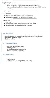 كابتن اوردر وشيف باريستا وسوبرفايزر بخبرة عملية في أرقى المنشاءات السياحية الفنادق والمطاعم والكافيهات في القاهرة والساحل الشمالي وشرم الشيخ. امتلك مهارات عالية في تشغيل الكافيهات والمطاعم، خدمة العملاء، وإدارة فريق العمل بكفاءة. جاهز للعمل فورا داخل المملكة ولدي اقامة سارية لمدة عام، ملتزم بتقديم تجربة مميزة للعملاء والمساهمة في زيادة الايرادات وتحسين جودة الخدمة