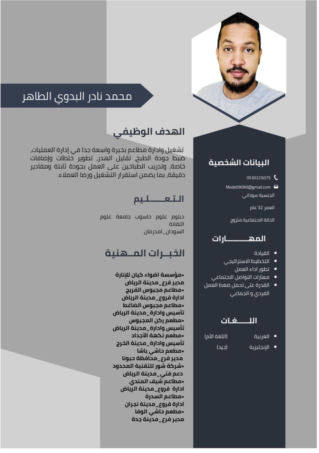 خبرة أكثر من 10 سنوات في مجال إدارة وتشغيل المطاعم والاشراف على العمل مهارات في تنظيم الفريق، متابعة العمل، والتعامل الجيد مع الآخرين