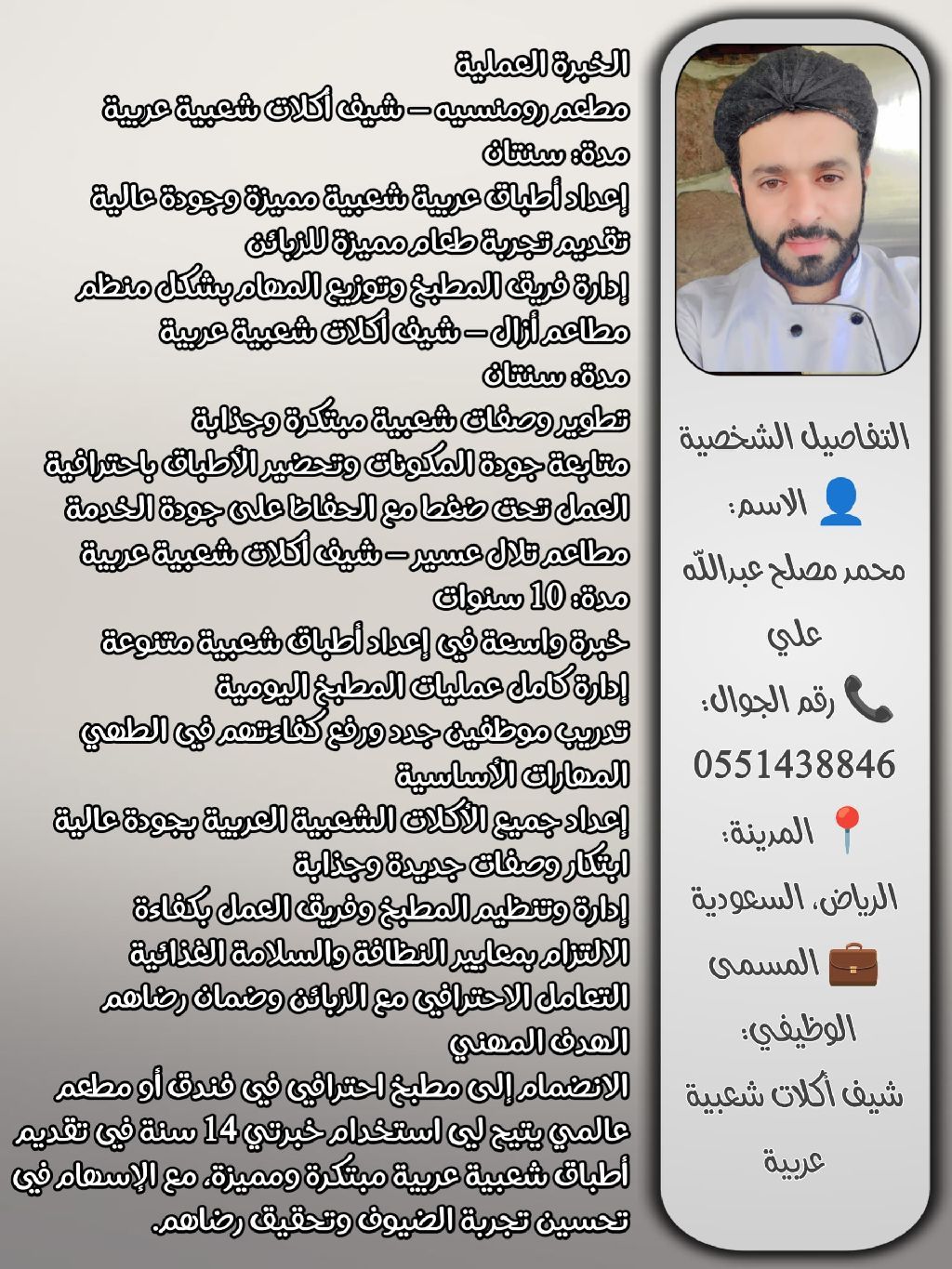 السيرة الذاتية الاسم محمد مصلح عبدالله علي رقم الجوال 0551438846 المدينة الرياض، السعودية المسمى الوظيفي شيف اكلات شعبية الخبرة العملية مطعم رومنسيه - شيف اكلات شعبية مدة سنتان اعداد أطباق شعبية مميزة وعصرية تقديم خدمة عالية الجودة للزبائن تنظيم فريق المطبخ وتوزيع المهام مطاعم ازال - شيف اكلات شعبية مدة سنتان تطوير وصفات شعبية جديدة إدارة المخزون ومتابعة جودة المكونات تقديم أطباق