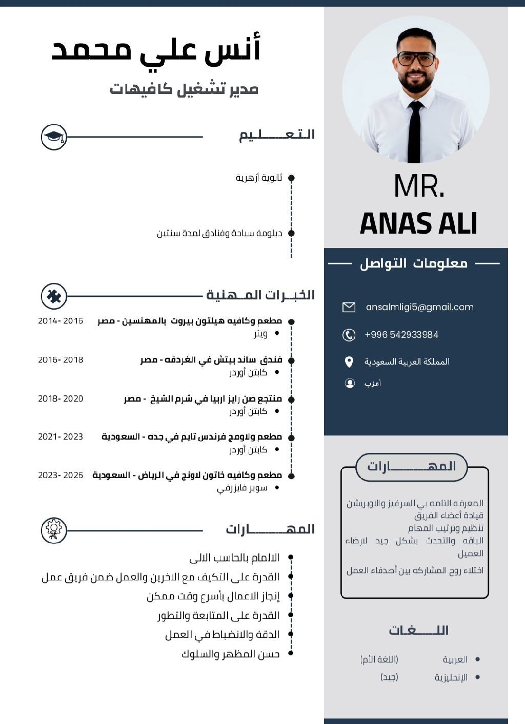 أنا ابحث عن عمل في مجال المطاعم والكافيهات والونجات سابقا كابتن اوردر وسوبر فايزر لعددة مطاعم ولاونجات القدرة الكاملة علي تنظيم الأوبريشن تنظيم وتريب السيرفر تطوير من أداء طاقم العمل الباقة في التحدث. لارضاء وهندلة العميل القدرة والتحمل لضغط العمل ملم الماما كامل بأسس وتعليمات إدارة الكافيهات والمطاعم والونجات أقامه سارية رخصة سياقة وكرت صحي امكانية نقل كفالة