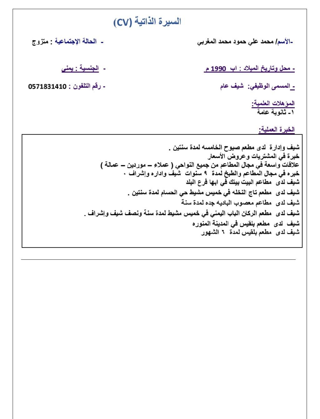 شيف محروقات وآدمات وشعبيات يمنيه ابحث عن عمل وتأشيرة وتختصم عليا شهريا من الراتب علما اننا لي خبرة كافية في الطباخه وتخطيط وأشرف على المطاعم شعبيه وسبق لي اننا اشتغلت تسع سنوات في الجبيل وجدة وأبها والمدنيه المنورة وخرجت خروج نهائي وأريد ادخل على بتأشيرة على الكفالة