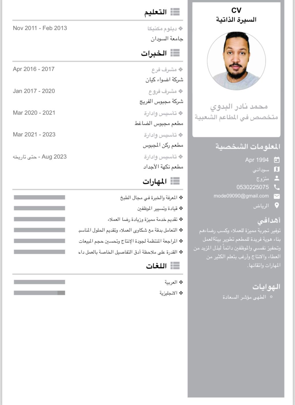 تأسيس وادارة مطاعم شعبية خبرة 9 سنين تخصص في المضغوط دجاج ولحم حاشي وأيضا دجاج شواية ودجاج على الفحم توجد خلطات خاصة