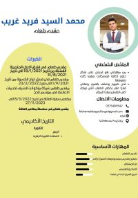 My name is Mohamed El Sayed, Egyptian nationality, 27 years old, looking for work in the field of restaurants, hotels and cafes, as a waiter in a cafe or restaurant, or as a captain of a restaurant hall, or as a captain of a cafe hall, or as an assistant grill chef, or as an assistant shawarma chef, or as an assistant hot chef, or as an assistant salad chef. I worked in a catering kitchen as an as