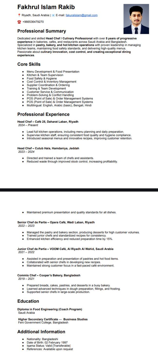 My name is Fakhrul Islam, I am a pastry chef, I have 6 years experience, as a pastry chef, now I need job. I living in Saudi Arabia. I know every kind of cake, every kind of pastry items, every kind of cookies, every kind of creep bread, Micron, Eclairs etc