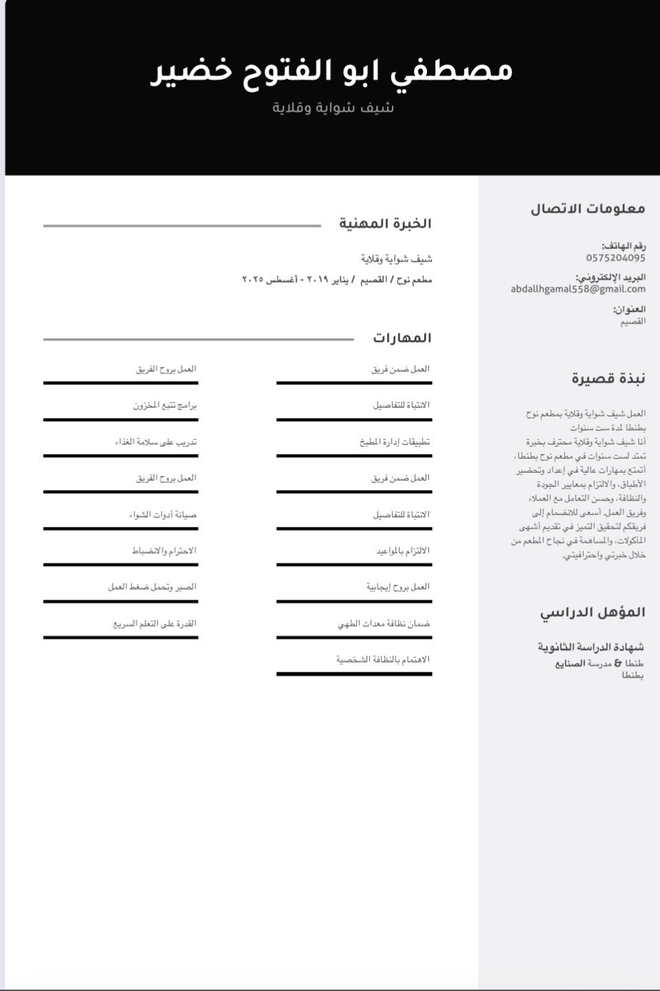 شيف شواية وقلاية مصري موجود في القصيم عملت بمطعم سمك في مصر لمدة 6 سنوات ابحث عن عمل إقامة قابلة للنقل