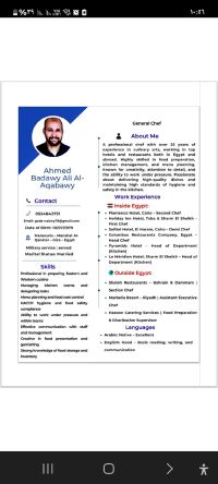 شيف انترناشونال سخن وبارد شرقي وغربي وعربي ولائم وبوفيهات وخلافه خريج سياحة وفنادق خبرة 24 عام في مجال الفنادق والمطاعم الفاخره متمكن من تسوية الكثير من أنواع الأرز والباستا والايدامات والسلطات والصوصات والشرب وعمل الولائم والبوفيهات وكثير من الأطباق المختلفه من اللحوم والدجاج والأسماك مقيم في الرياض أقامه وكرت صحي ساريين مستعد لعمل تست متميز