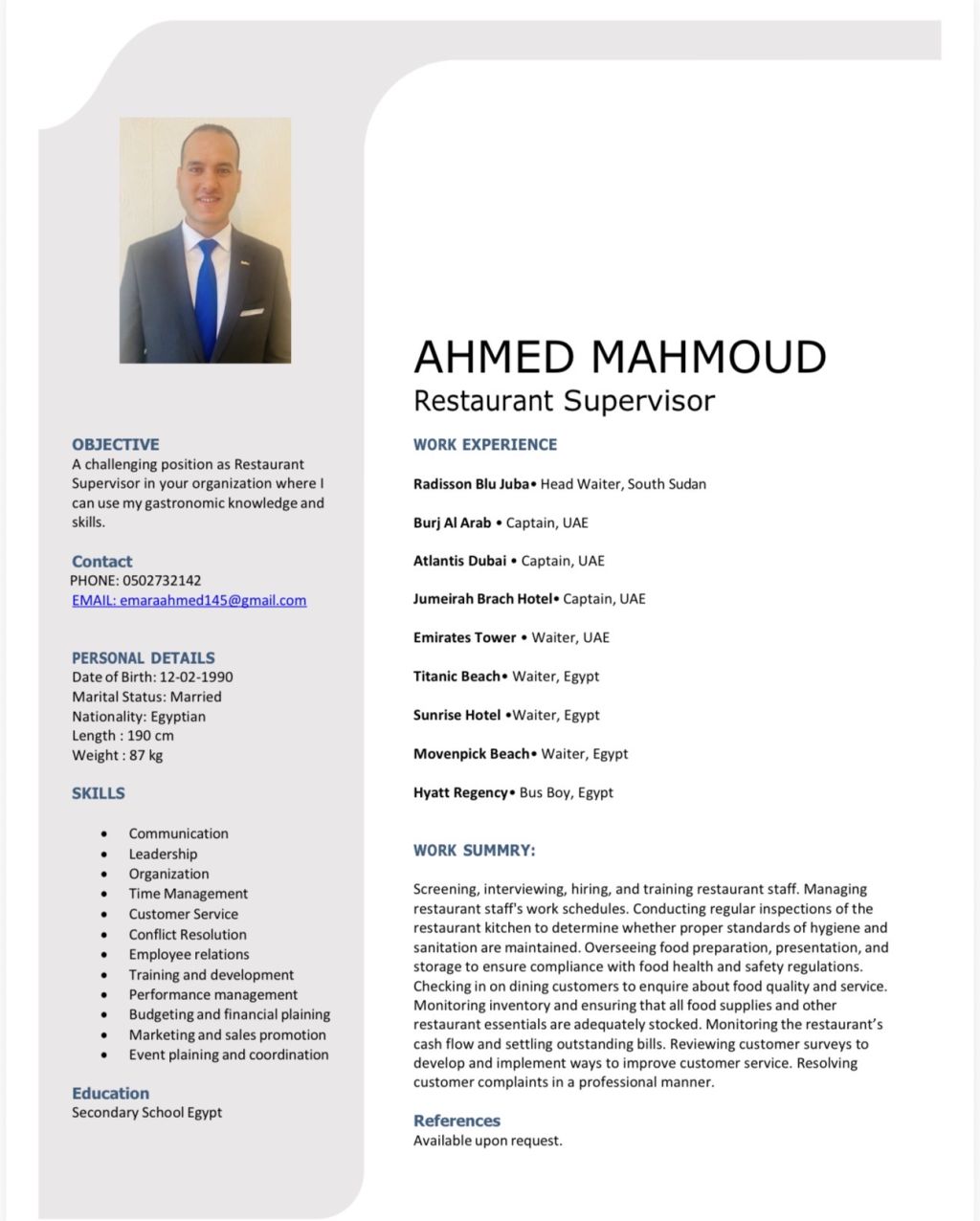 سوبر فايزر خبرة في الفنادق الانترناشونال والمطاعم متواجد في الرياض إقامة سارية جاهز لنقل كفالة أول مرة متمكن من قيادة السيارات ابحث عن فرصة عمل دوام كامل