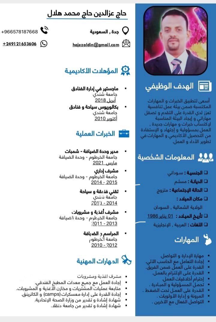 خبير ادارة الفنادق والمطابخ ابحث عن عمل حاصل على بكالوريوس وماجستير في ادارة الفنادق