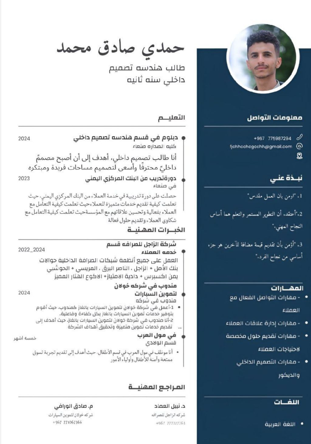 أتشرف بالتقدم لشغل احدى الوظائف المتاحة لديكم. أنا حمدي صادق محمد، أدرس حاليا دبلوم هندسة تصميم داخلي، وامتلك خبرة عملية في خدمة العملاء من خلال عملي في شركات الصرافة والتعامل المباشر مع العملاء، بالاضافة الى مهارات قوية في التواصل وحل المشكلات والعمل بروح الفريق. أطمح الى الانضمام الى فريقكم والمساهمة بخبرتي ومهاراتي في دعم أهداف منشاءاتكم وتحقيق أفضل النتائج. أ