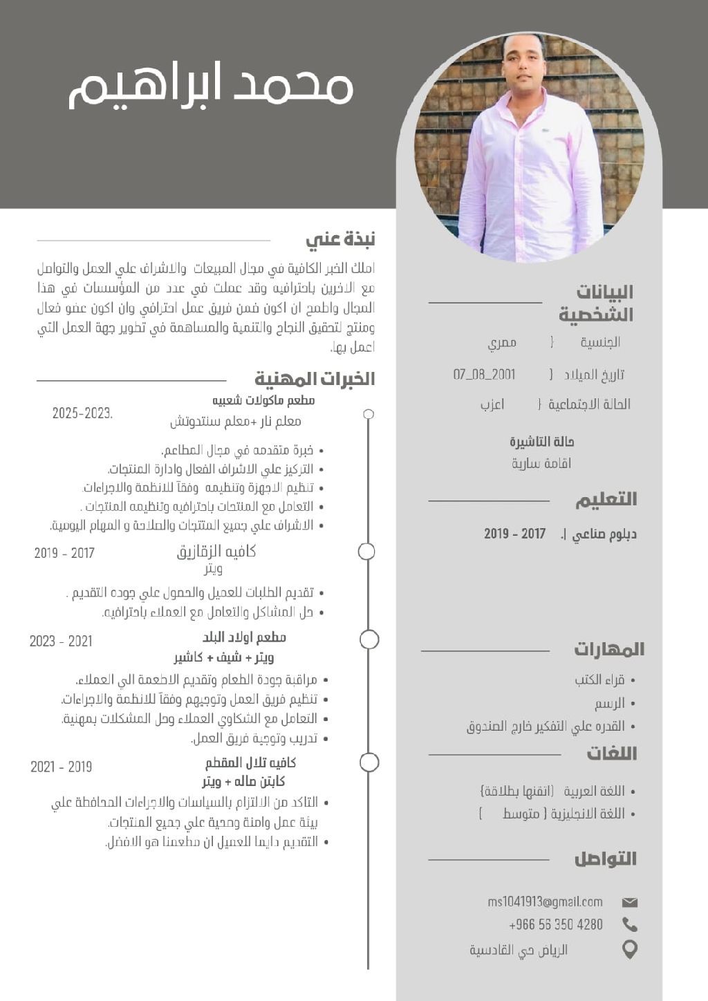الاسم/ محمد سامي العمر / 24 سنة خبرة بقطاع المطاعم والكافيهات ابحث عن فرصة عمل وايتر بيك اب مساعد شيف إقامة ساري