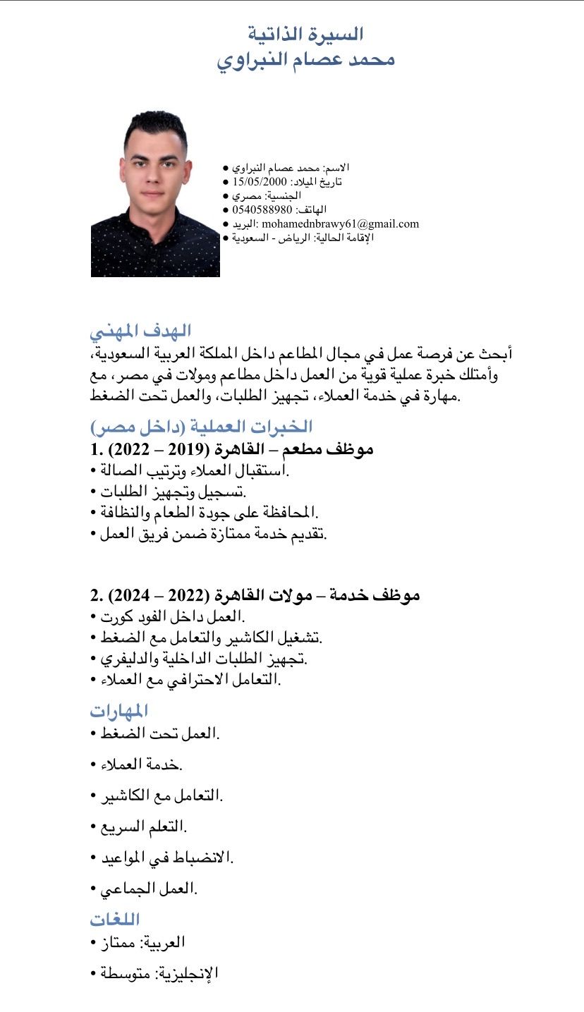 Hello, I am an Egyptian currently residing in the Kingdom of Saudi Arabia, looking for a job opportunity in restaurants, malls, or as a cashier. I have solid experience working in major restaurants and malls in Egypt, with skills in Customer service - Order preparation - Cashier operations - Organization and cleaning - Working under pressure and following work standards