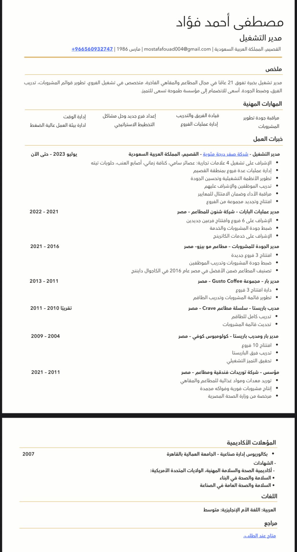 مدير تشغيل بخبرة تفوق 21 عاما في مجال المطاعم والمقاهي الفاخرة، متخصص في تشغيل الفروع، تطوير قوائم المشروبات، تدريب الفرق، وضبط الجودة. أسعى للانضمام الى شركة طموحة تسعى للتميز