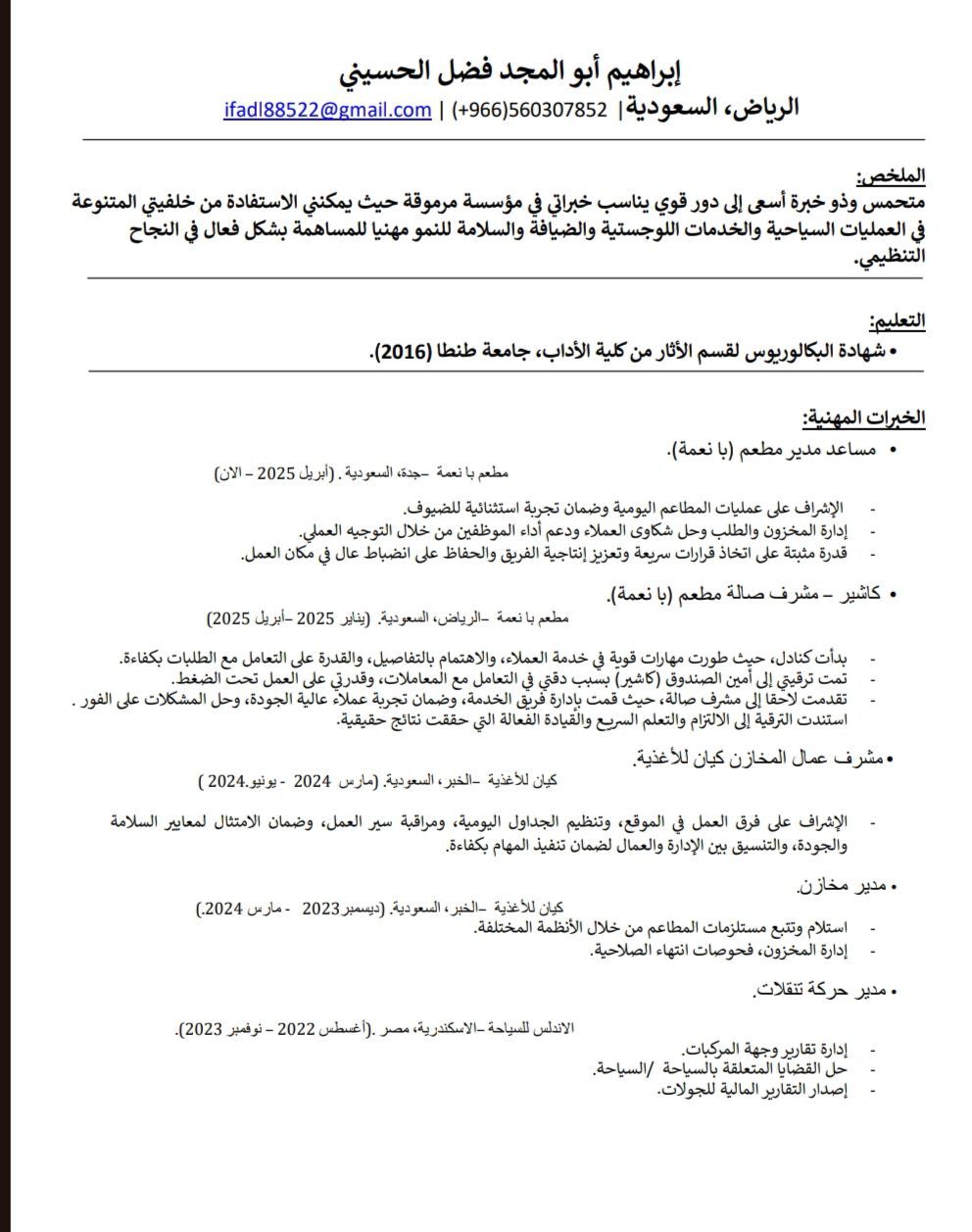 Seeking Work in Tourist and Restaurants in Saudi Arabia