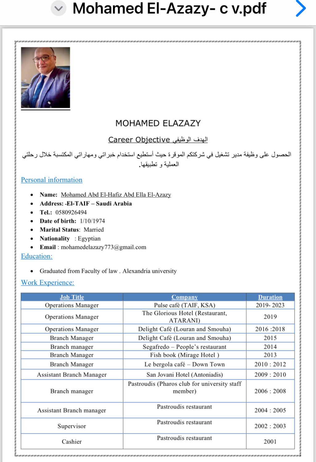 مدير تشغيل خبرة أكثر من 20 عام في مجال تأسيس وتشغيل المطاعم والكافيهات (وضع النظام المحاسبي للمؤسسة حسابات وتكاليف وتوريد ومشتريات ومخازن وتقارير الكسب والخسارة، عمل دليل تشغيلي لكافة أعمال التشغيل، تدريب الموظفين على خدمة العميل والاشتراطات الصحية وكيفية رفع المبيعات) إقامة سارية مع امكانية نقل كفالة