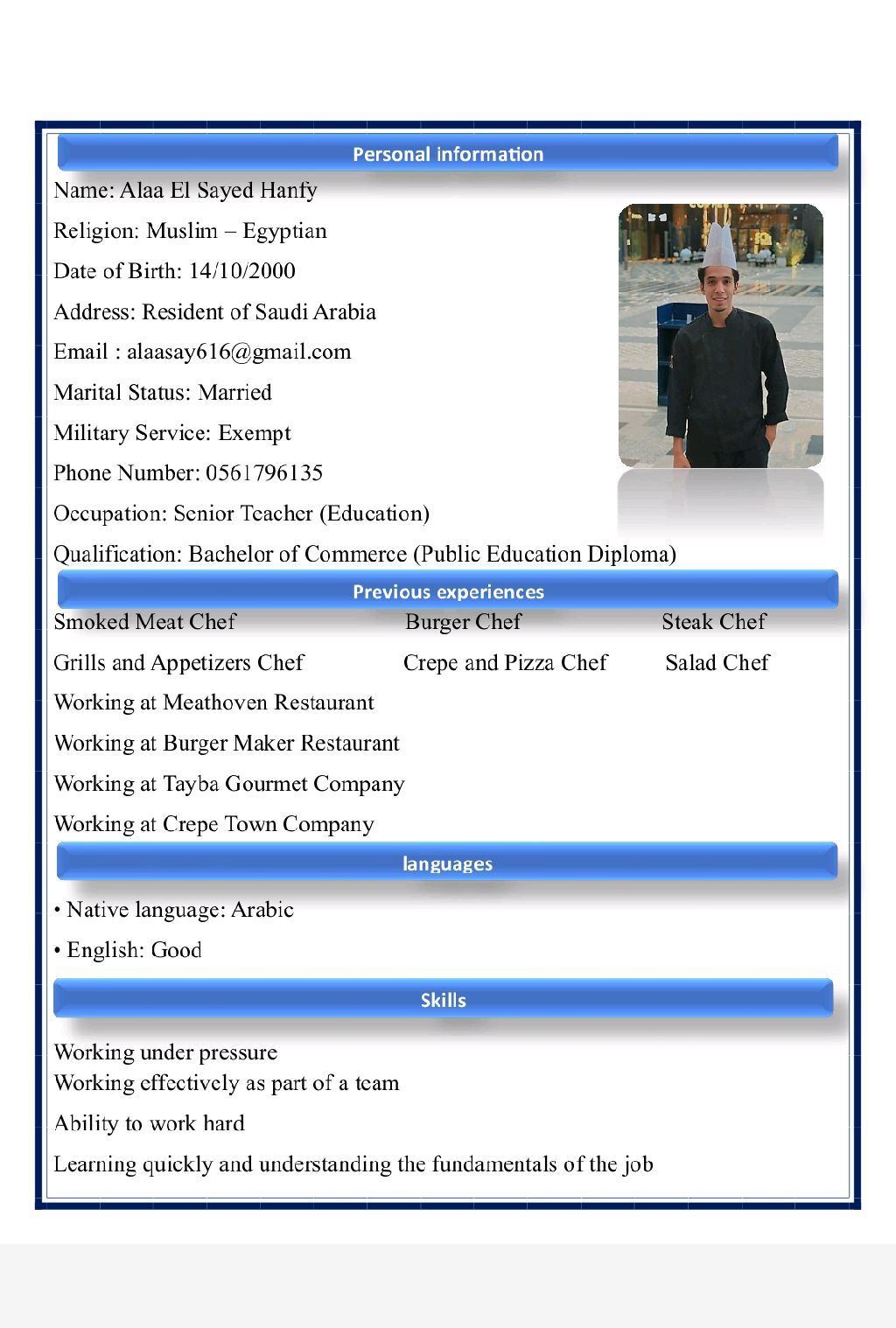شيف في جميع التخصصات الموجودة في السي في مصري الجنسية العمر 25 ابحث عن عمل