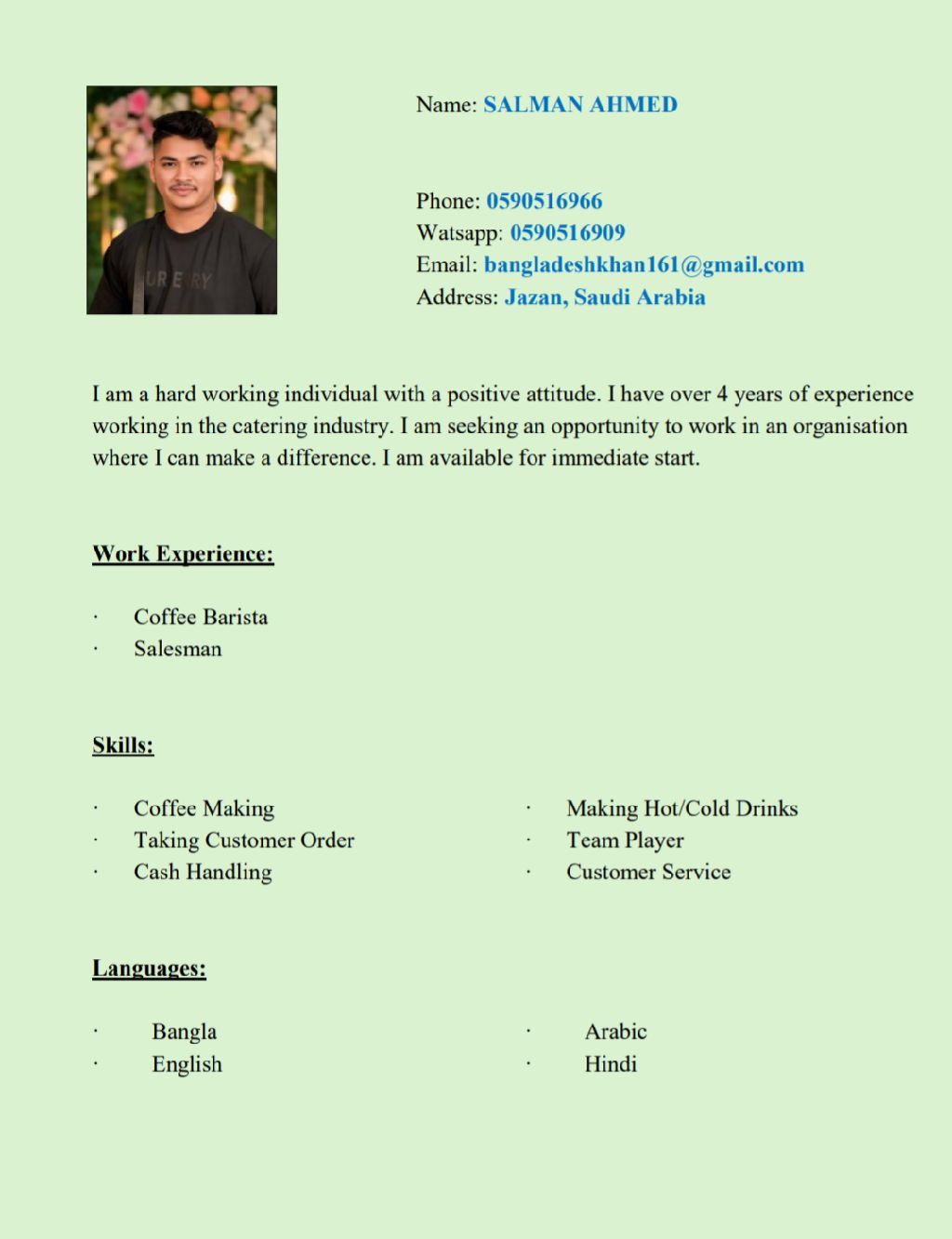 Professional Summery Dedicated customer - focused Coffee Shop worker with 4 years of experience in a fast - paced cafe environment. Skilled in preparing high - quality beverages, providing excellent customer service and maintaining a clean and welcoming atmosphere. Passionate about coffee culture and always eager to enhance the customer experience. Skills Food preparation Order taking barist expe